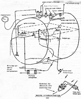 Used steam from the turbine cannot be discharged directly into the atmosphere because the used steam can be used again by condensing (condensed) into water in the condenser M. The condensate water that is produced is then sucked by the condensate pump O to be channeled to the reservoir, which is a hot tub (hotwell) ) P. The filling water from the hot tub P is then sucked up by the filling pump Q which will be forwarded to the kettle via the preheater R and economiser F.